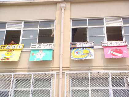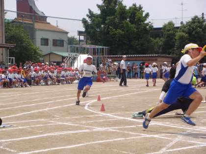 とても順調に進行し,午前の部は予定より早くに終了しました。午前の部最終プログラムは,低学年の選手リレーです。激走の末,青組が勝ちました。