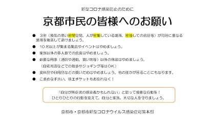 「新型コロナ感染防止のために京都市民の皆様へのお願い」が示されました。→クリック