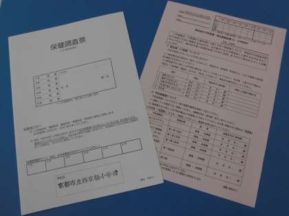 「保健調査票」「感染症の予防接種・既往歴調査票」「フッ化物洗口希望調査書」などの保健関係の書類は,記入いただき登校日にお持たせください。