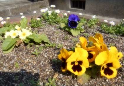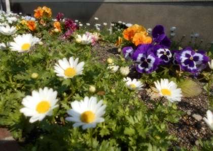 がっこうに ある ひまわりがっきゅうの かだんには いま, いろいろな おはなが さいています。きれいな はなを みていると, こころが あかるく なりますね。