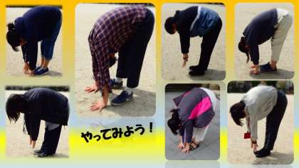 息をはきながら地面にタッチ!!(前屈)