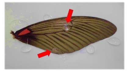 そしてもう一つすごいところは・・・水をはじくところ!この粉の働きによって雨の日でもはねが濡れずに飛ぶことができるのです。すごいですよね。