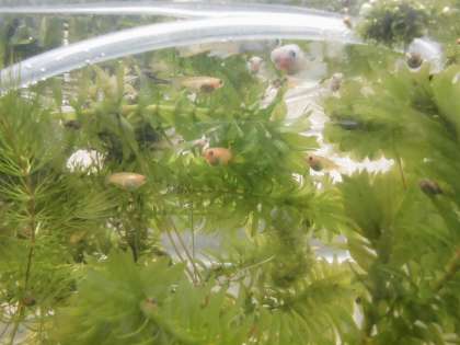なぜなら,このメダカさんたちは,理科室で育てているからです。小さなメダカは,昨年度,卵(たまご)から産(う)まれたメダカさんたちです。今年も,たくさんのメダカが産まれたらうれしいなぁ。