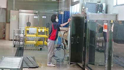 給食調理員さんや栄養教諭は,給食が始まったらすぐに着られるように給食のエプロンのお直しをしてくださっています。また,給食室のおそうじも一生懸命してくださっています。