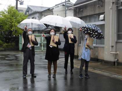 あいにくの雨ですが,6年生担任の4人,課題やお知らせのプリントを届けに出発します。