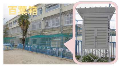 この白い小さな小屋のようなもの・・・「百葉箱」(ひゃくようばこ)といいます。この中に温度計が入っていて正確な気温をはかることができます。今度,学校に来たときに中の様子をみんなで見てましょう。お楽しみに!