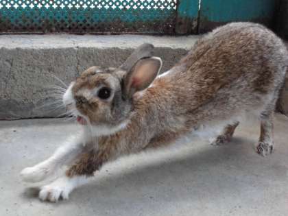 写真(しゃしん)を見てください。「イチ,ニイ・・・」とコロンちゃんもみんなに負(ま)けないように,ストレッチ運動(うんどう)でからだをほぐしていますよ・・・!