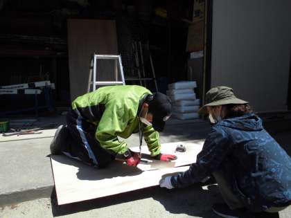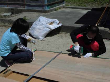 初夏の日差しを受けて,体育倉庫の年代物の扉をよみがえらせるための作業中です。