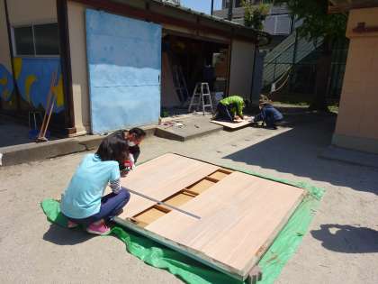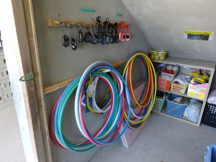 休校期間中に,管理用務員さんや教職員の方々の力を借りて,体育倉庫を使いやすく整備したり,扉をきれいにしたりしました。