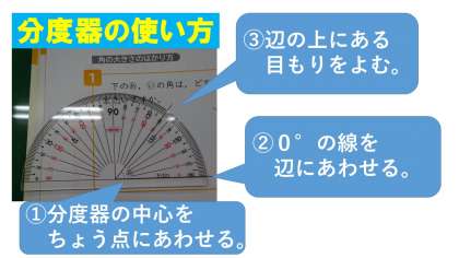 もし分度器を持っていない人がいたら,教科書の一番後ろのページについているものを使いましょう。
