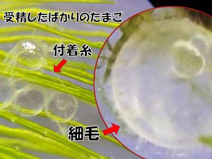 びっくりです。どうして!?と思いましたが,よーーーーく見ると,なんと糸のようなものでつながっていたのです。調べてみると,これは『付着糸(ふちゃくいと)』とよばれるもので,たまごを水草などにつけやすくする糸らしいのです。また,付着糸だけではなくたくさんの細い毛,細毛もたまごにはついているようです。顕微鏡で見なければわからないような毛です。