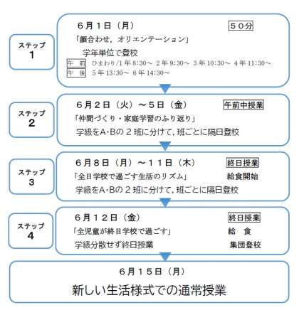 本校においても,本方針を踏まえ,下記のとおり,6月1日(月)から再開し,引き続き,新型コロナウイルス感染症の感染拡大防止対策を徹底しながら,段階的に学校教育活動を再開して参りますので,ご連絡申し上げます。