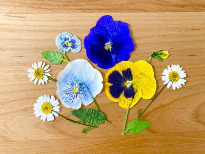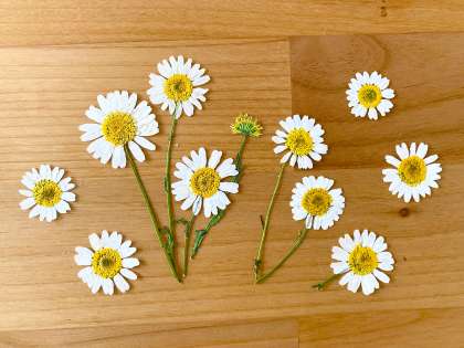 つぼみや はっぱも おしばなに して みました。 「パンジー」という おはなでも つくって みたのですが, どちらも いろあざやかなまま ぺったんこ! きれいに できました。