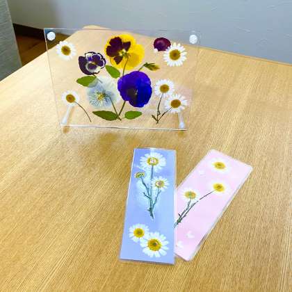 おしばなが かんせいしたら, ほんに はさむ しおりにしたり, しゃしんたてに かざったり するのも いいですよ。 きぶんが あかるく なりますね。