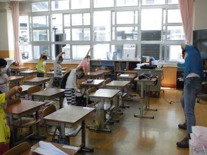 二回目となった今日は,先生の姿を見るなり「体操の時間や!」「あの曲がいいな」などの声があがりました。