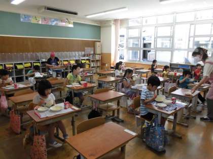 1年生の初めての給食は,みんな静かに,たいへんお行儀よくいただくことができました。とっても美味しくて,たくさんの人が,おかわりもしました。これからは,好き嫌いせずに少し苦手かなと思う食べ物でも,一口は食べてみましょうね。給食調理員さんの愛情のこもった給食,とっても美味しいですよ,Bグループの人も,楽しみにしてくださいね。