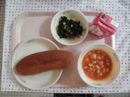 「黒糖コッペパン」「牛乳」「大豆と鶏肉のトマト煮」  「ほうれんそうのソテー」