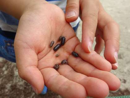 ふりかえってみると,手いっぱいのダンゴムシが!