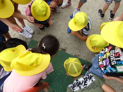 大きな石や,植木鉢をもちあげて,子どもたちはいきいきと生きもの探しをしています。