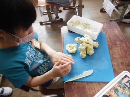 図画工作科では,切って かきだして くっつけての学習を行いました。ねん土を切ったりかき出したりしながら思いついたものを工夫して表しました。かきべらなどを使うことで楽しみながら取り組むことができました。