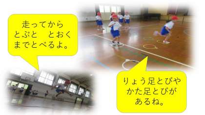 ジャンプして遠くまで!どんどん跳ぶよ。輪っかをめざしてぴよーん!ゴールまで片足ジャンプでぴょんぴょんぴょん!縄と縄の間を跳びこしてびょーん!ケンケンでトントントン!