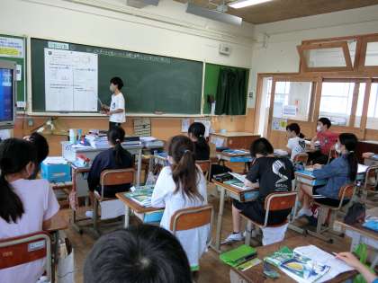 今日の算数の時間は,分数×分数の学習をしました。長方形や直方体の辺が分数になっても整数や小数の場合と同じように公式を使って計算できることを学びました。友達が式や図を使って説明するのをしっかりと聞いていました。みんなで学習する楽しさを感じられました。