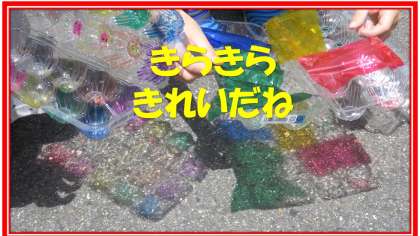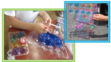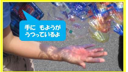 空き容器にセロファンを貼ったり,ペンで色付けをして,色遊びをしました。光にすかすと,「容器のでこぼこがもようになって,とてもきれい。」「作ったものを合わせると,もようや色が重なってきれい。」と子どもたちは大興奮でした。ものにうつすだけでなく,色付けしたペットボトルを転がしてみたり,横から見たり,組み合わせたりと工夫をしながら,光の見え方をためすことで,そのおもしろさに気づいていたようです。