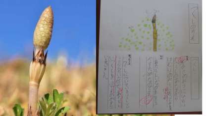 次は,自分が選んだ本から草木の知恵を読んで見つける学習をしました。「先生,どんぐりの木は,わざと実を落として,動物に種を運ばせているんだって。」「ひまわりは,種ができたら,種を落とすために下を向くんだって。」と多くの知恵を見つけて,まとめました。