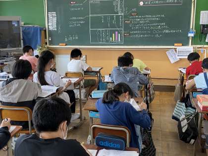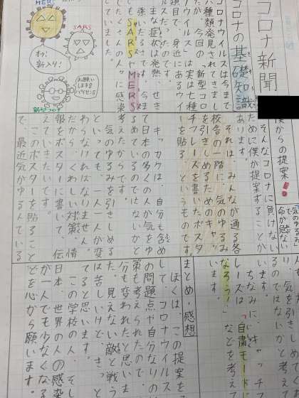 総合的な学習の時間では,「コロナを乗り越えるために」というテーマで,国語の提案文の学習と関連付けて新聞づくりをしています。感染リスクを抑えるために日ごろから意識していること,調べて初めて知ったことをまとめ,分かりやすく伝えるための工夫を考えながら取り組んでいます。