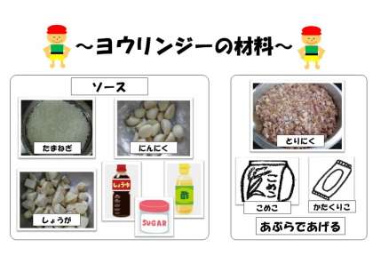 1.鶏肉を揚げる。(給食では米粉と片栗粉をまぶしています。)