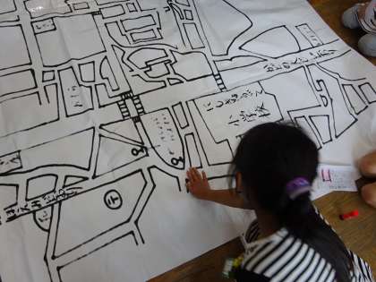 自分たちが住む町のお気に入りの場所や人,ものなど意見をだしあって,大きな地図をつくっていきます。地図にカードをはっていき,みんなのお気に入りで溢れた地図がだんだんとできていきます。地図を見ながら,「こんなところにパン屋さんがあるの?」「ここの店には,えんぴつや本が売っているんだ。」など,さまざまな気づきをつぶやく子どもたち。普段生活している町ですが,まだまだ新しい発見がたくさんあります。どんな地図が完成するのか楽しみです。