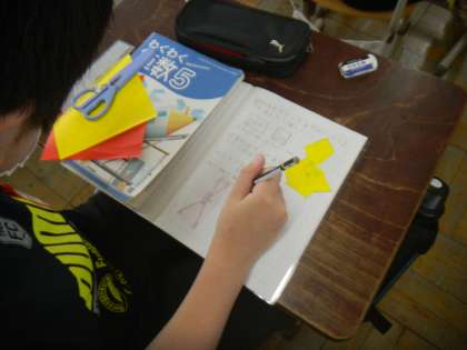 先週,三角形の3つの角の和はどんな三角形でも180度になることを学習した子どもたち。そのときに話題にもなった四角形の4つの角の和はどうなるのか,またまた折り紙を使って検証してみました。
