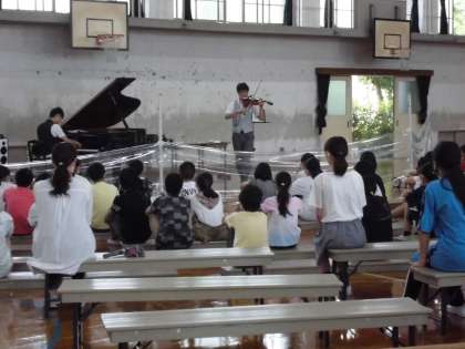 子どもたちのよく知っているジブリの曲や,聞いたことのあるクラシック音楽などをピアノとバイオリンで演奏してくださいました。途中,「バイオリンに挑戦」のコーナーもあり,実際に演奏させてもらうこともできました。