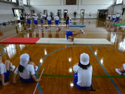 3時間目は体育館でマット運動を行いました。今日の学習は,今まで練習してきた成果を披露する発表会でした。はじめはなかなかうまくできなかった技も,いろいろな場で練習することにより,できるようになってきました。