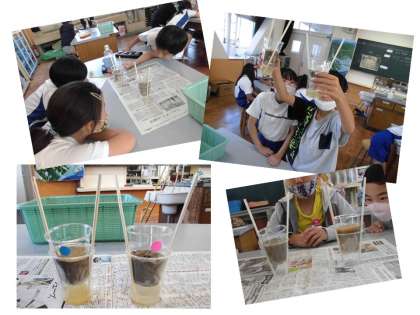 校庭の土はゆっくり水がしみこんだのに対し,砂場のすなはあっという間にしみこみました!これは土のつぶの大きさに違いがあることにも気づきました。