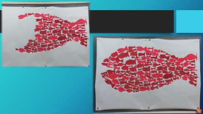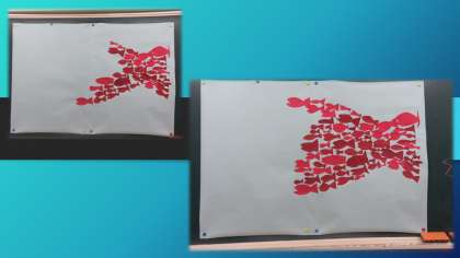 お話を知らない1年生でもお話の様子が伝わるように,段ボールでこんぶやいせえびを作りました。また,仲間と協力をして大きな魚になる場面を作りました。少しずつ出来上がっていく様子に歓声があがりました。