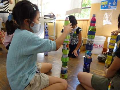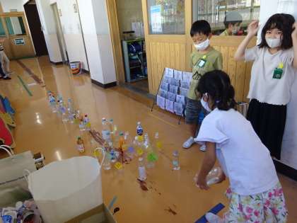 生活科では,材料の特徴を生かして遊びを考えました。各グループに分かれ,より楽しく遊ぶためにさまざまな工夫をしています。「得点が高いペットボトルには,水を入れてみようよ!」「ガラクタだと思っていたものが,こんなに楽しい遊びになるんだ!」と意見を出し合い,身近なもので楽しい遊びを考えることができました。