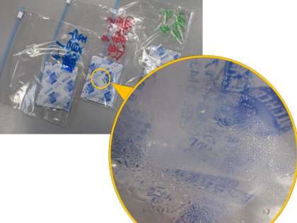 そこで,子どもたちが考えた学校中のあらゆる場所で実験してみることにしました。保冷剤を空気を抜いた袋に入れて空気を冷やし,袋の外側に水てきがついたら水じょう気があるということ。教室,ろうか,運動場,体育館,職員室…その場所に保冷剤の入った袋を置いてみると,結果はなんとすべて同じ結果が!よく見ると水てきがついていました。