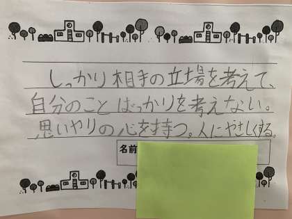 4年生は,「雨のバスていしゅう所で」のお話を通して,みんなが気持ちよく過ごすためにはどのようなことを心がけなくてはいけないかを考えました。そのためには相手の気持ちを考えることが必要だという意見がたくさん出ました。今回学習したことをこれからの学校生活にも活かしてほしいと思います。