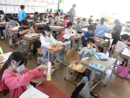 1円玉が1gだということを知り,てんびんに1円玉を載せることで,いろいろな物と比べることができました。「えんぴつは1円玉,5枚と釣り合うから同じ重さだ。」や「けしごむは1円玉,10枚より重いから10g以上や。」などたくさんの発見をしながら学習する姿が見られました。これからは量りを使い,もっと重いものを調べます。いろいろな物の重さを知り,量感を養っていってほしいなと思います。
