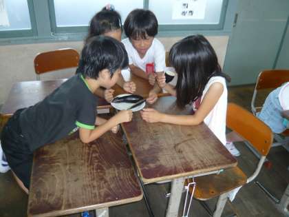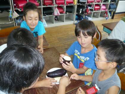 子ども達は五感を使って観察し、たとえば、ナスの外側より内側のほうがやわらかいことや、種の並び方、切ったほうがなすのにおいが強いことなどいろいろな発見していました。最後に試食するときには、嫌いだといっていた子もぺロリと食べていました(^^)懸命に学んでくれている様子が嬉しかったです。
