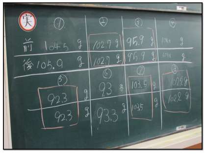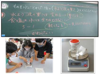 「ものを水にとかした後の水溶液の重さは,どうなるのだろうか。」という学習問題のもと,今回は食塩を使って実験してみました。予想では重くなる,溶けた分軽くなる,重さは変わらない,と3つ出たクラスもありましたが結果は…溶かす前の重さと溶かした後の重さが同じでした。重さがほぼ同じ班もありましたがぴったり同じ班もたくさんあり,子どもたちは「おぉ〜!」と驚いている様子でした。