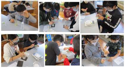 この実験ではメスシリンダーを使って水をはかる作業や,電子てんびんを使うところなど初めての実験器具も扱います。5年生の子どもたちは安全に気を付けながらとてもスムーズに実験を行うことが出来ました。