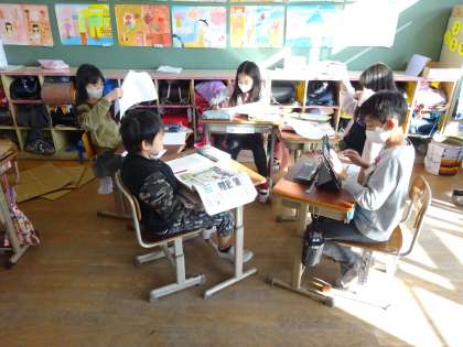 グループごとに,どのようにまとめるのか相談をして,実際に展示するものを作ったり,新聞にまとめる内容を考えたりしています。自分たちで考えたものを形にしていくことは難しいですが,子どもたちはやりがいを感じ,一生懸命取り組んでいます。