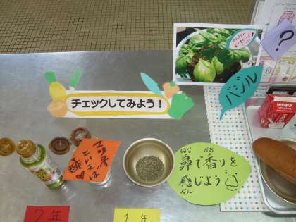 給食室の展示には、バジルとオリーブオイル・りんご酢をおきました(^^)