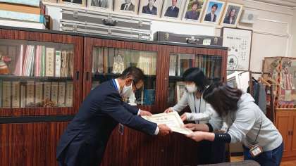 本来なら,全国学校体育研究大会福井大会で表彰される予定でしたが,コロナ禍により,全国大会が中止となったため,京都市教育委員会体育健康教育室の方が賞状を届けてくださいました。