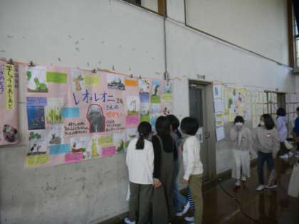 体育館で行われている「学習発表会」をみんなで見に行きました。自分たちの学年の作品はもちろんですが,他の学年の作品を見て,「おもしろいな」「こんなふうにまとめると分かりやすいな」とたくさんのよいところを見つけていました。