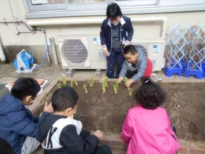 夏野菜を育てていた畑(花壇)から,残った茎や葉を取り除いて肥料を混ぜ,冬野菜を育てるために準備をしていました。そこへ,みんなで九条ネギを植えました。