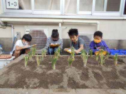 また,理科の学習で,植えたばかりの九条ねぎの観察もしました。苗を植えた5日後でしたが,少し育ってきている部分をしっかり見つけることができました。