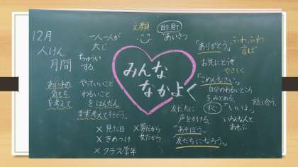 12月は人権月間です。朝会で校長先生に人権についてのお話していただいたり,人権にかかわる本を読んでいただいたりしました。それをもとに「楽しく笑顔あふれる学校」を目指して,自分たちにはどんなことができるのかを話し合いました。「ふわふわ言葉をつかうといいね。」「ありがとうが素直に言えるといいね。」「やっていいことと悪いことを考えてから行動しなきゃね。」とたくさんの意見が出ました。